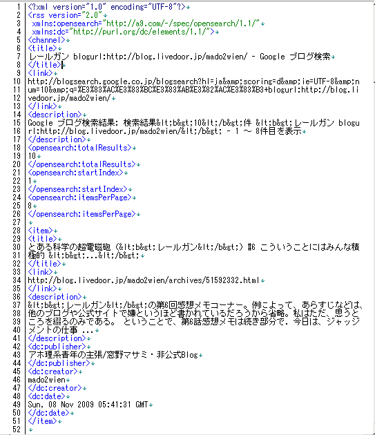どうやら、フィードが、http://blogsearch.google.co.jp/blogsearch_feeds?hl=ja&scoring=d&q=%E3%83%AC%E3%83%BC%E3%83%AB%E3%82%AC%E3%83%B3+blogurl:http://blog.livedoor.jp/mado2wien/&ie=utf-8&num=10&output=rss