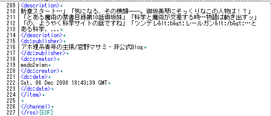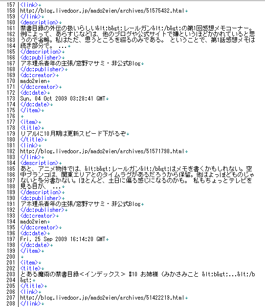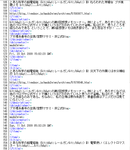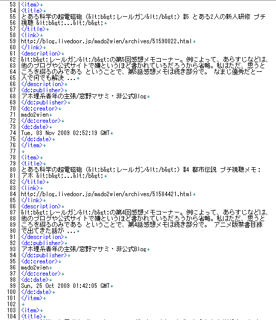 をアドレスバーに唱えた後の結果ページから得られた、フィードだかxmlファイルだか何だかよくわからないものを、terapadで開、続き部分に書かれているような文言が書かれていた。(続き部分に書かれているのは整形後の文)
